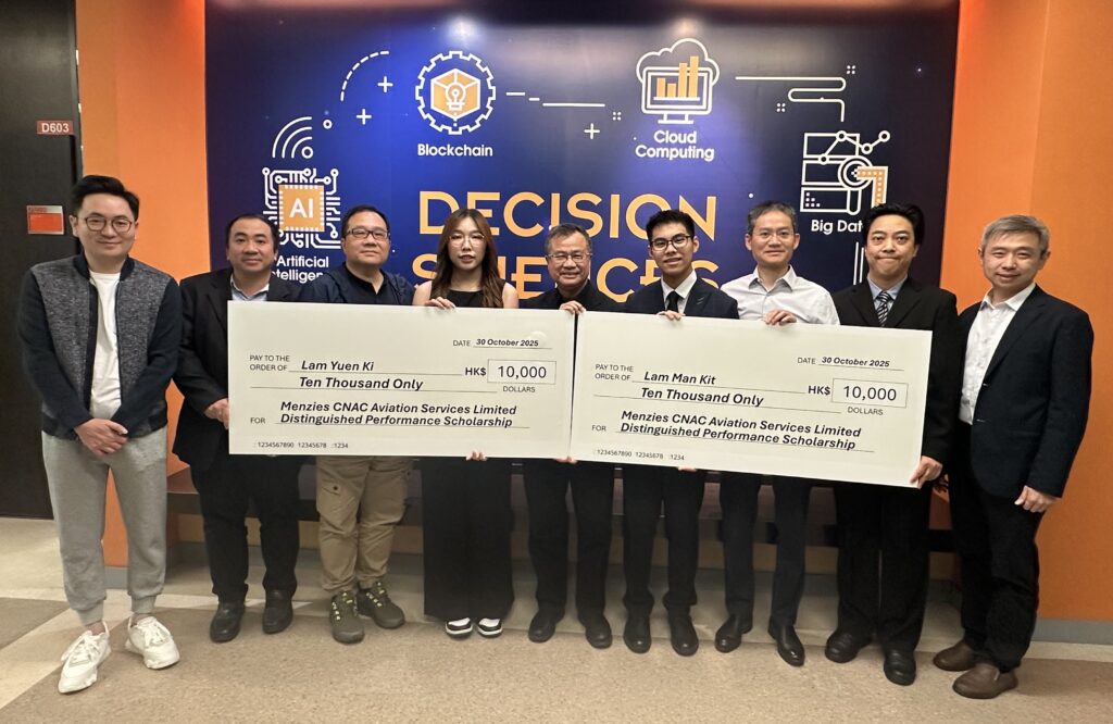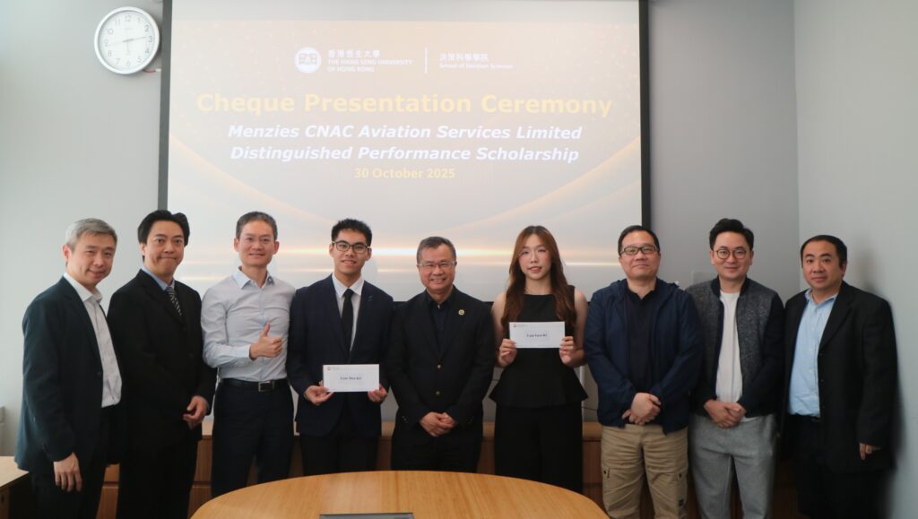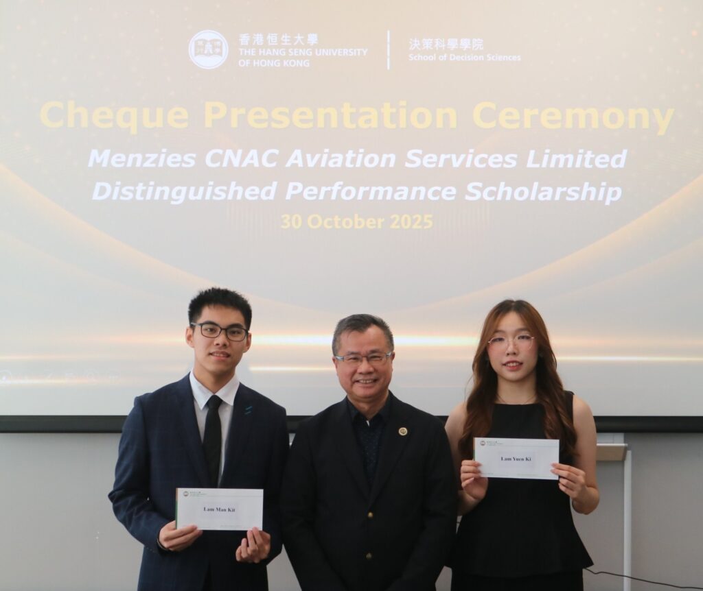 To recognise undergraduate students at the School of Decision Sciences (SDSC) of the Hang Seng University of Hong Kong (HSUHK) for their outstanding academic achievements, the Menzies CNAC Aviation Services Limited continued its establishment of the “Menzies CNAC Aviation Services Limited Distinguished Performance Scholarship” for the 2024-2025 academic year.